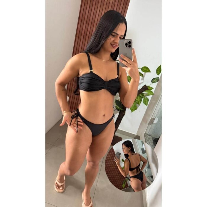 Biquini com aplique de cordas na parte dos seios, possui alças removíveis