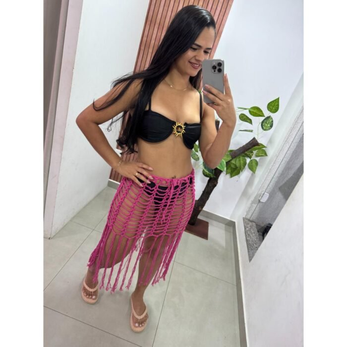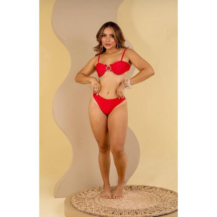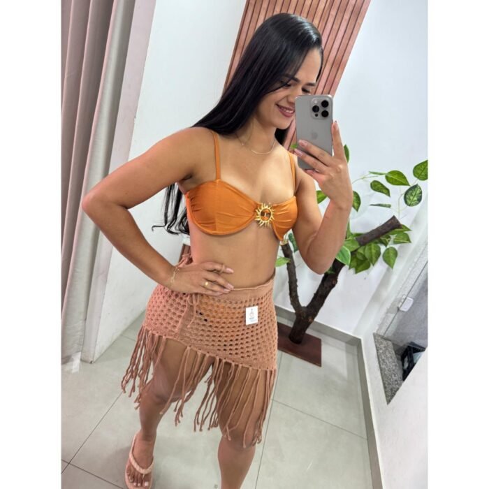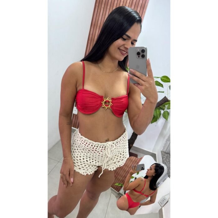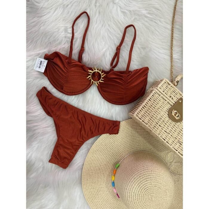 Biquíni com recorte super moderno em formato de concha e aplicação de acessório com desenho de sol frontal, alças de regulagens, modelo da calcinha fio duplo.