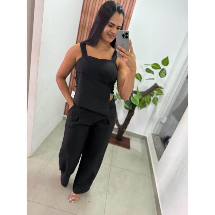 Conjunto de linho, com elástico nas costas tanto na calça quando no cropped detalhe com recorte lateral com botão fake.