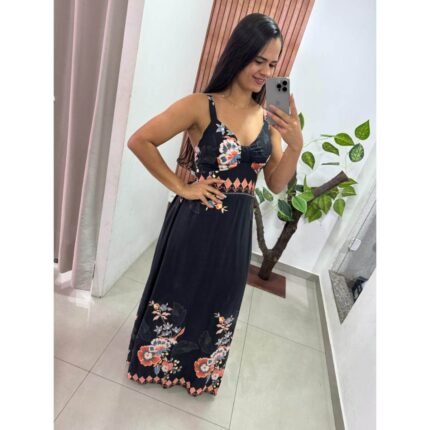 Vestido longo mais casual, de tecido leve, possivelmente viscose ou algodão, com um caimento solto.